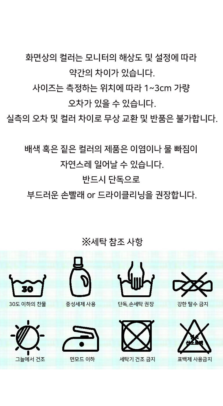 * 사이즈는 재보시는 기준에 따라 약간의 오차가 있을 수 있으며, 모니터 사양에 따라 색상이 다르게 보일 수 있습니다.