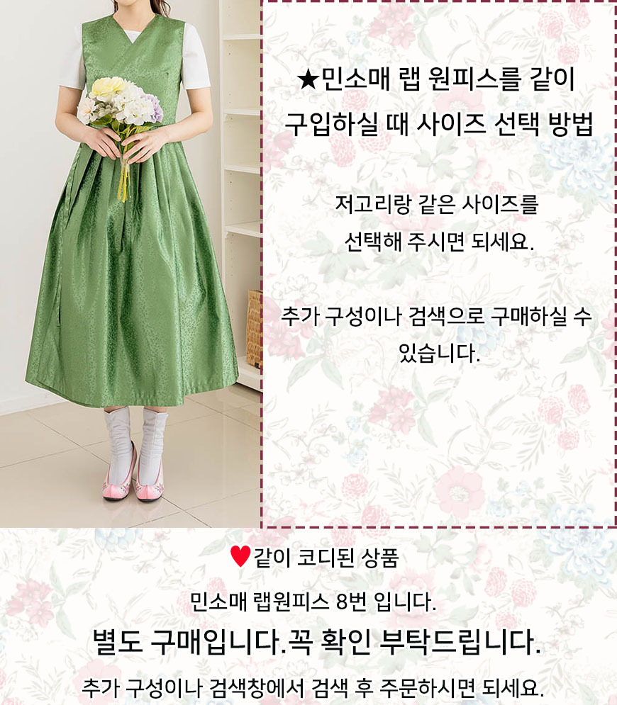 구매하기 저고리 옵션 선택 S(55) M(66) L(77) 88(XL)(+7,000) 99(2XL)(+10,000) 100(3XL)(+13,000) 110(4XL)(+16,000) 120(5XL)(+19,000) 민소매 랩원피스(8번) 옵션 선택 선택안함 S(55)(+75,000) M(66)(+75,000) L(77)(+82,000) 88(XL)(+85,000) 99(2XL)(+88,000) 100(3XL)(+91,000) 110(4XL)(+94,000) 120(5XL)(+97,000) 수량 옵션 적용가 66,000원 장바구니 구매하기